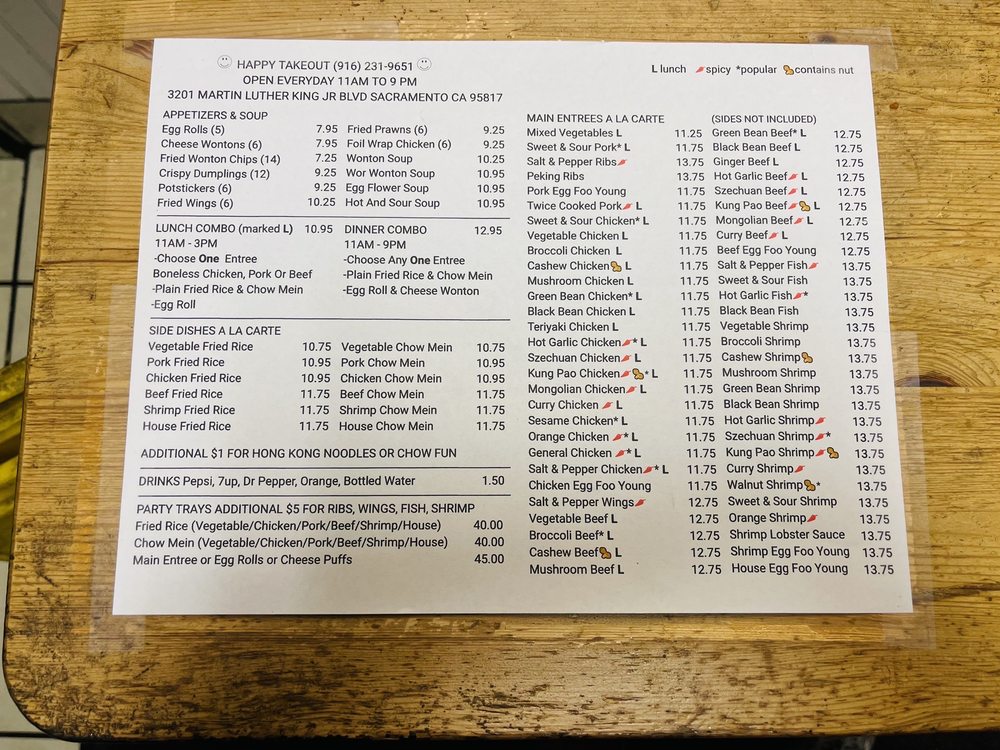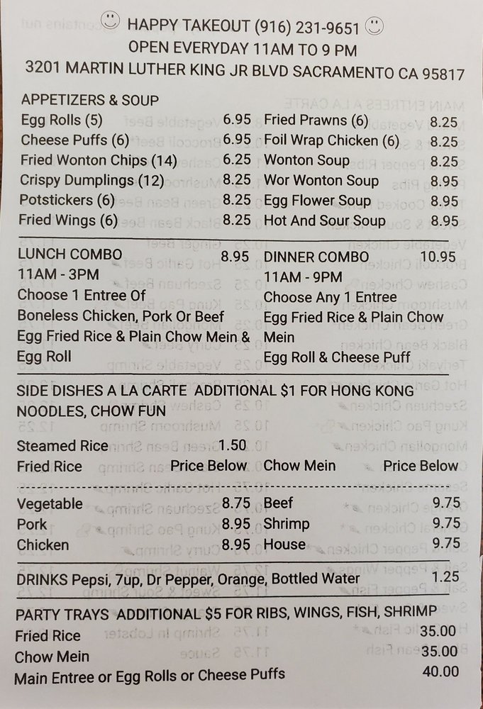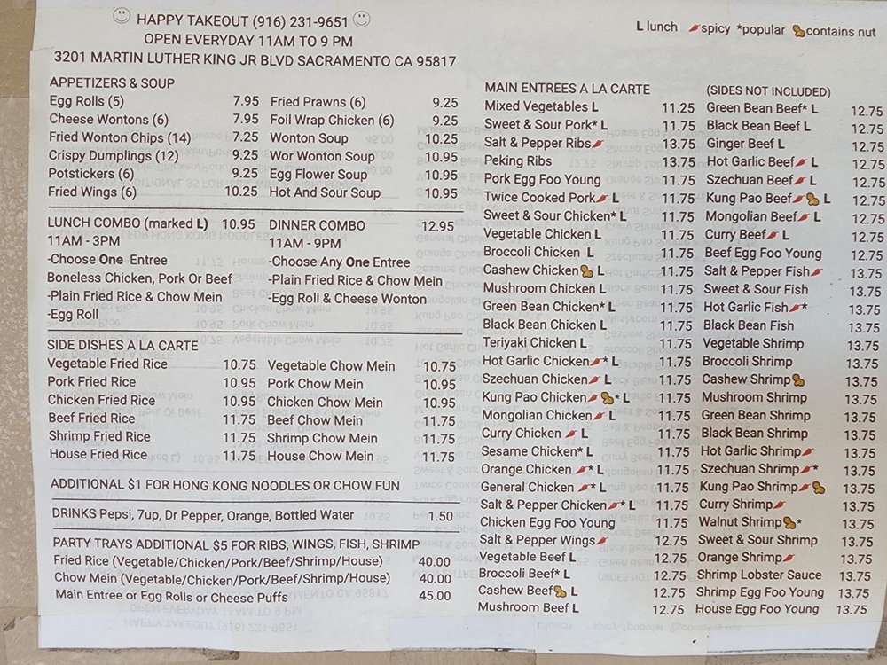 Introducing Happy Takeout, a Chinese takeout spot located in Sacramento, CA. This Asian-owned restaurant offers a variety of appetizers like egg rolls, cheese wontons, and fried wings. The lunch combo includes a choice of pork, chicken, or beef entree with fried rice and chow mein. For dinner, enjoy an entree with fried rice, chow mein, crab cheese wonton, and an egg roll. Customers rave about the generous portions and delicious flavors, with favorites including salt and pepper chicken, cream cheese wontons, and orange chicken. The staff is friendly, the service is quick, and the prices are affordable. Stop by Happy Takeout for a satisfying meal that will leave you feeling happy and full.