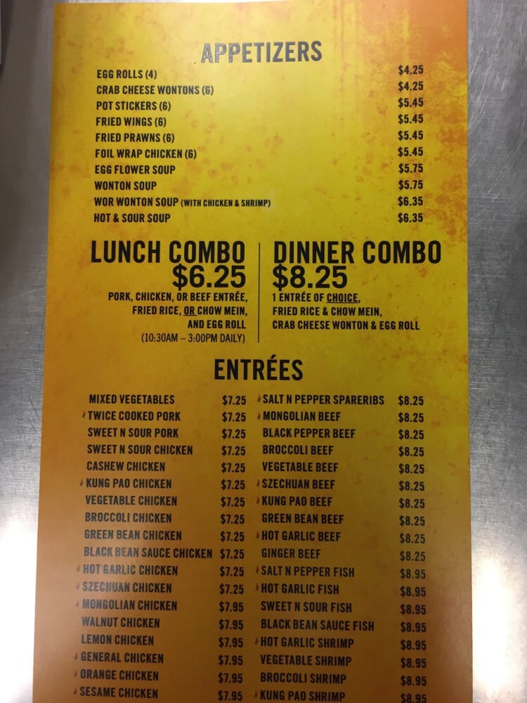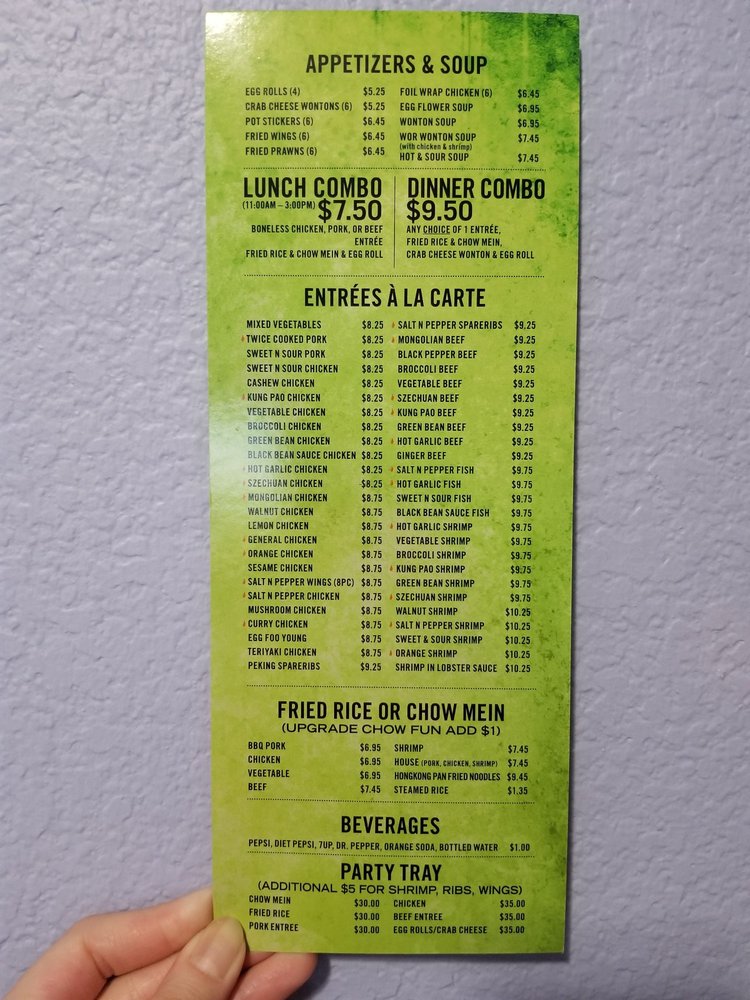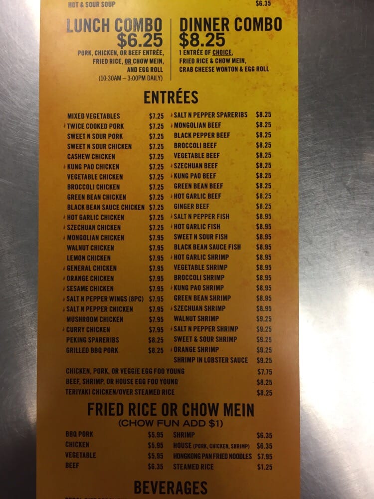 Choose one boneless pork, chicken or beef entree. Comes with fried rice, chow mein and egg roll.